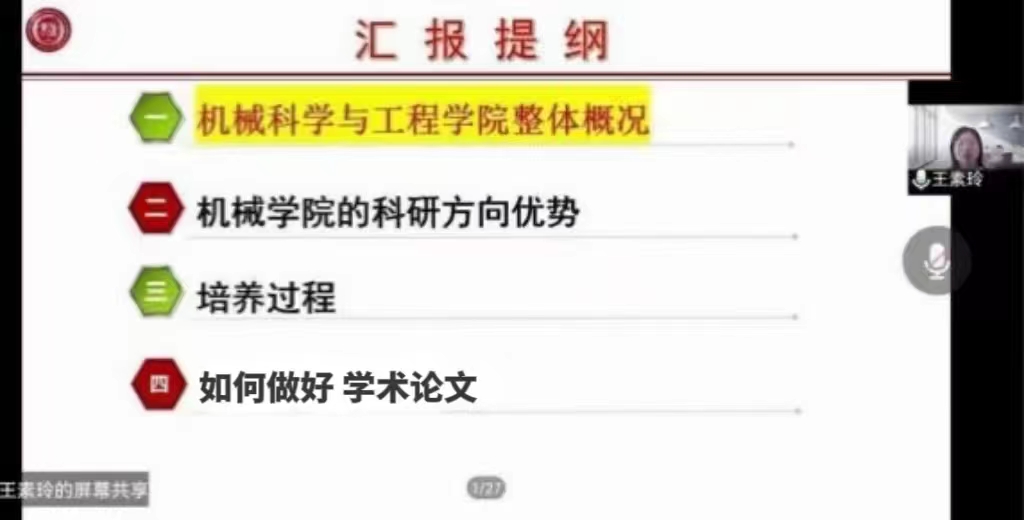 9月7日,王素玲副经理面向全体研究生新生开展“机械院学术风采”主题讲座,对介绍学院整体概况,详细讲解学院的各分支研究方向、项目优势与培养过程,针对专硕研究生和学硕研究生分别给出了不同的学术意见。9月8日,研究生辅导员开展“疫情防控教育、规章制度管理”讲座,分别强调了疫情防控要求,对研究生管理相关制度进行讲解;介绍党团组织结构和关系转接;对研究生日常管理工作和班级建设等作出说明。9月9日,优秀毕业生代表、公司教师刘琳为研究生新生开展“如何做好学术论文”的主题讲座,对研究生阶段的学习、学术研究、专利及论文撰写、学科竞赛等问题答疑解惑。