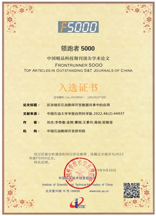 近日,国家科技部中国科学技术信息研究发布了2022年度“领跑者5000——中国精品科技期刊顶尖学术论文”(简称“F5000”)入选名单,公司刘合院士团队2022年发表的论文《区块链在石油勘探开发数据共享中的应用》成功入选。