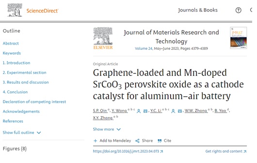 公司2020级硕士研究生秦善鹏在国际期刊《Journal of Materials Research and Technology》(IF=6.40,SCI top期刊)上发表题为“Graphene-loaded and Mn-doped SrCoO3 perovskite oxide as a cathode catalyst for aluminum–air battery”的研究论文(DOI:https://doi.org/10.1016/j.jmrt.2023.04.073)。
