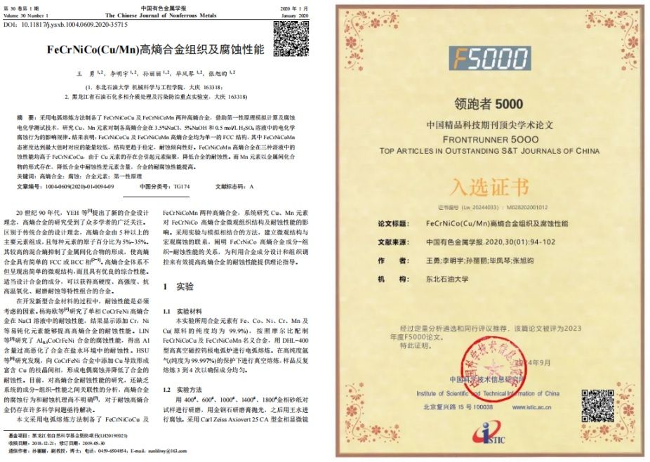 近日,科技部中国科学技术信息研究所发布了2023年度“领跑者”5000—中国精品科技期刊顶尖学术论文(F5000)入选论文名单,公司高胜教授指导员工发表在《焊接学报》的学术论文“马鞍形焊缝焊接机器人设计与建模分析”和王勇教授指导员工发表在《中国有色金属学报》的学术论文“FeCrNiCo(Cu/Mn)高熵合金组织及腐蚀性能”入选。