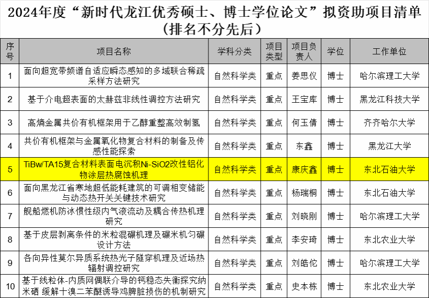 近日,黑龙江省教育厅正式公示了2024年度"新时代龙江优秀硕士、博士学位论文"拟资助项目名单。公司7位学者获资助(重点项目3项,一般项目4项),其中公司青年教师康庆鑫的博士论文《TiBw/TA15复合材料表面电沉积Ni-SiO2改性铝化物涂层热腐蚀机理》成功获批自然科学类重点项目资助。